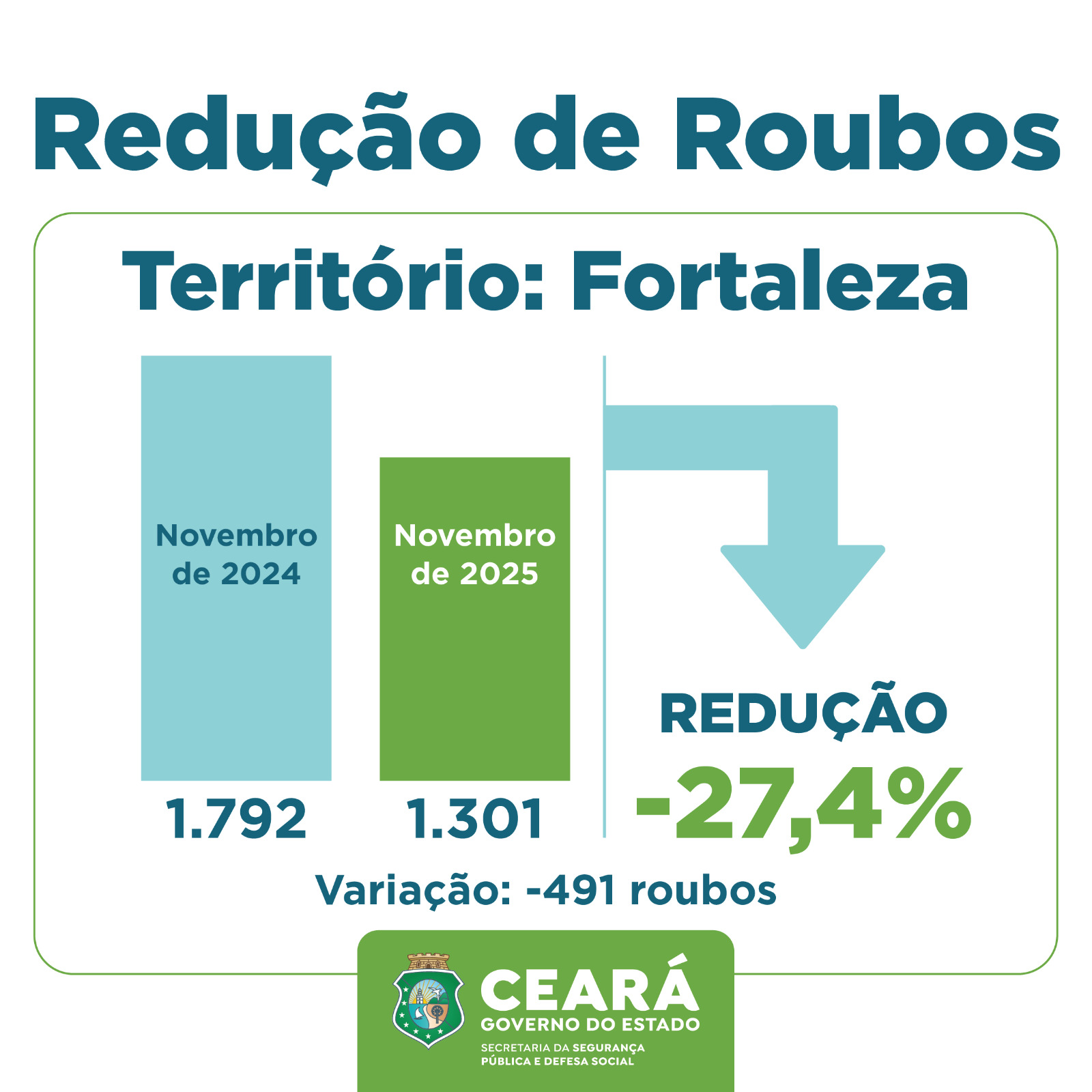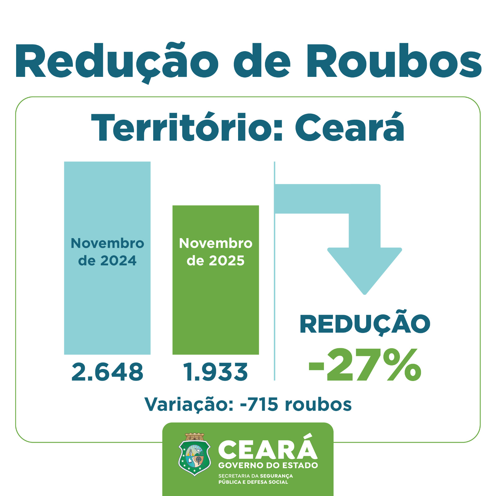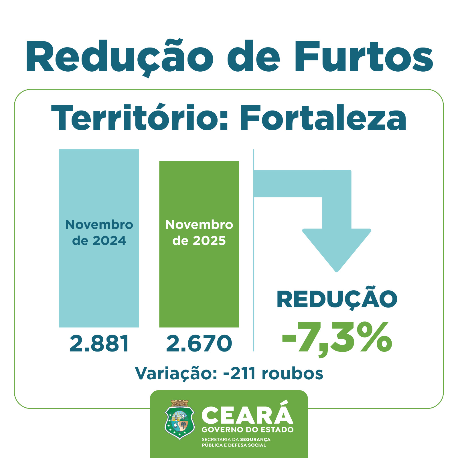O Ceará registrou, em novembro de 2025, uma redução de 27% nos Crimes Violentos contra o Patrimônio (CVP), categoria que engloba os roubos. O resultado, fruto do trabalho intensificado das Forças de Segurança do Estado, representou o menor número de ocorrências para o mês de novembro desde o início da série histórica, em 2015. Em Fortaleza, a diminuição foi ainda ligeiramente maior: 27,4%. Já os furtos apresentaram redução de 8,3% no Ceará e de 7,3% na capital. Os dados foram divulgados pela Superintendência de Pesquisa e Estratégia de Segurança Pública (Supesp), vinculada à Secretaria da Segurança Pública e Defesa Social (SSPDS).