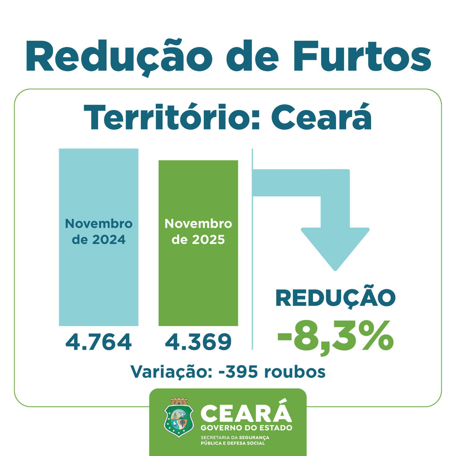 No comparativo entre novembro de 2025 e novembro de 2024, os furtos apresentaram redução de 8,3% no estado. Foram 4.369 ocorrências no 11º mês deste ano, 395 a menos que os 4.764 registrados no mesmo período do ano passado. A RMF apresentou a maior redução percentual no mês: 15,9%, passando de 627 para 527 casos. O Interior Norte registrou diminuição de 11,6%, com 466 ocorrências em 2025, frente a 527 em 2024. Em Fortaleza, a diminuição foi de 7,3% (2.670 furtos em 2025, diante de 2.881 em 2024). O Interior Sul, por sua vez, passou de 729 para 706 registros, uma redução de 3,2%.