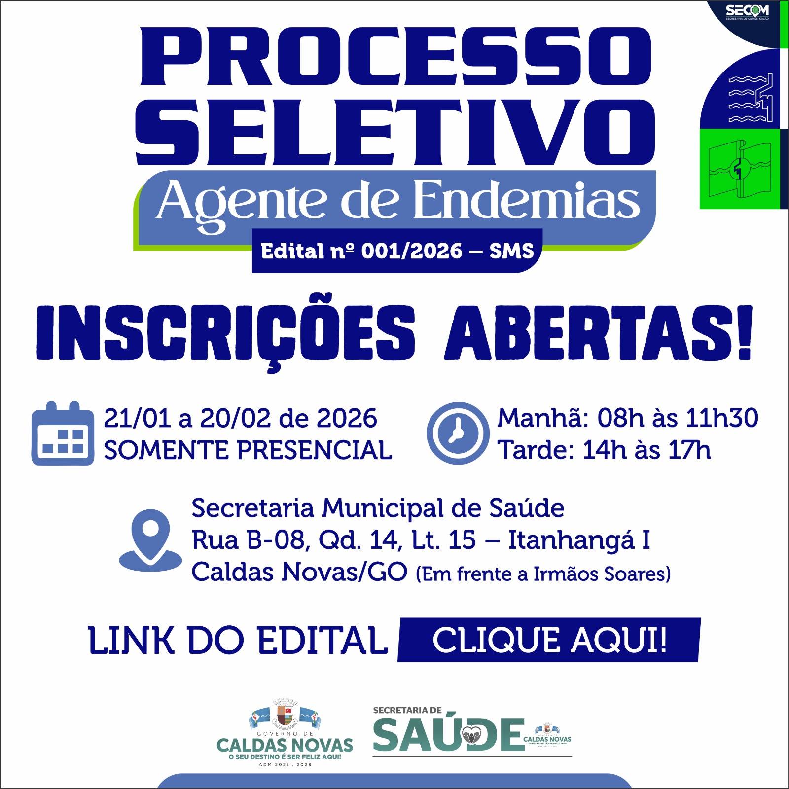 A Secretaria Municipal de Saúde de Caldas Novas publicou o Edital nº 001/2026 – SMS, que trata da contratação temporária de Agentes de Combate às Endemias, em razão da situação de calamidade pública em saúde decretada no município, causada pelo aumento expressivo de casos de dengue e outras arboviroses.