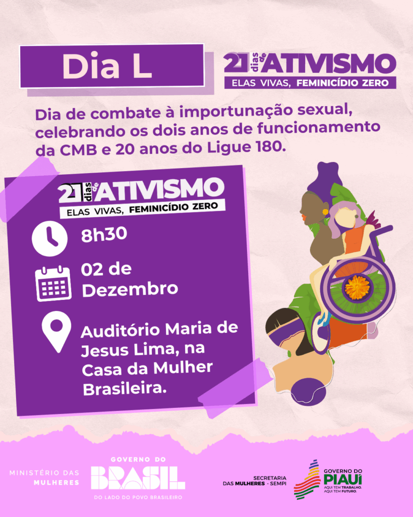 A Secretaria das Mulheres do Piauí (Sempi) realiza, nesta terça-feira (2), às 8h30, um encontro no auditório Maria de Jesus Lima, na Casa da Mulher Brasileira (CMB) de Teresina, para celebrar os 20 anos da Central de Atendimento à Mulher – Ligue 180. A atividade integra a programação dos 21 Dias de Ativismo pelo Fim da Violência contra as Mulheres, reforçando o compromisso do Governo do Estado com a proteção e a garantia de direitos das mulheres piauienses.