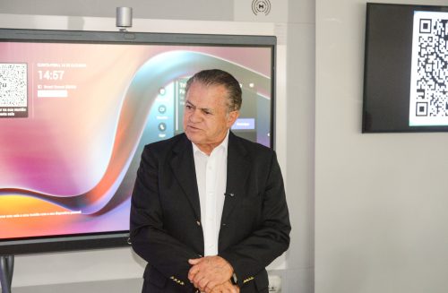 Durante o evento, também foram apresentados dispositivos de compartilhamento de conteúdo que funcionam sem o uso de rede Wi-Fi. Com eles, o professor pode exibir vídeos e outros materiais nos monitores da sala sem precisar de cabos ou de conexão à internet. Outro destaque é a tela interativa equipada com câmera e microfone embutidos, que funciona como lousa digital e permite videoconferências, espelhamento de tela, abertura de documentos e outras funcionalidades integradas.
